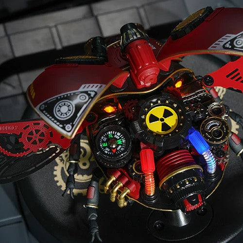 La MI02 transforme l’image classique de la coccinelle en une créature mécanique ultra stylisée, aux ailes en métal et à l’ossature futuriste. Inspirée du design steampunk, cette maquette conserve les rondeurs naturelles du scarabée tout en y ajoutant une dimension mécanique visuellement saisissante. L’effet est renforcé par les détails métalliques intégrés aux ailes et à l’abdomen. Montée sur sa base, elle devient un objet d’art technologique à la fois décoratif et interactif.