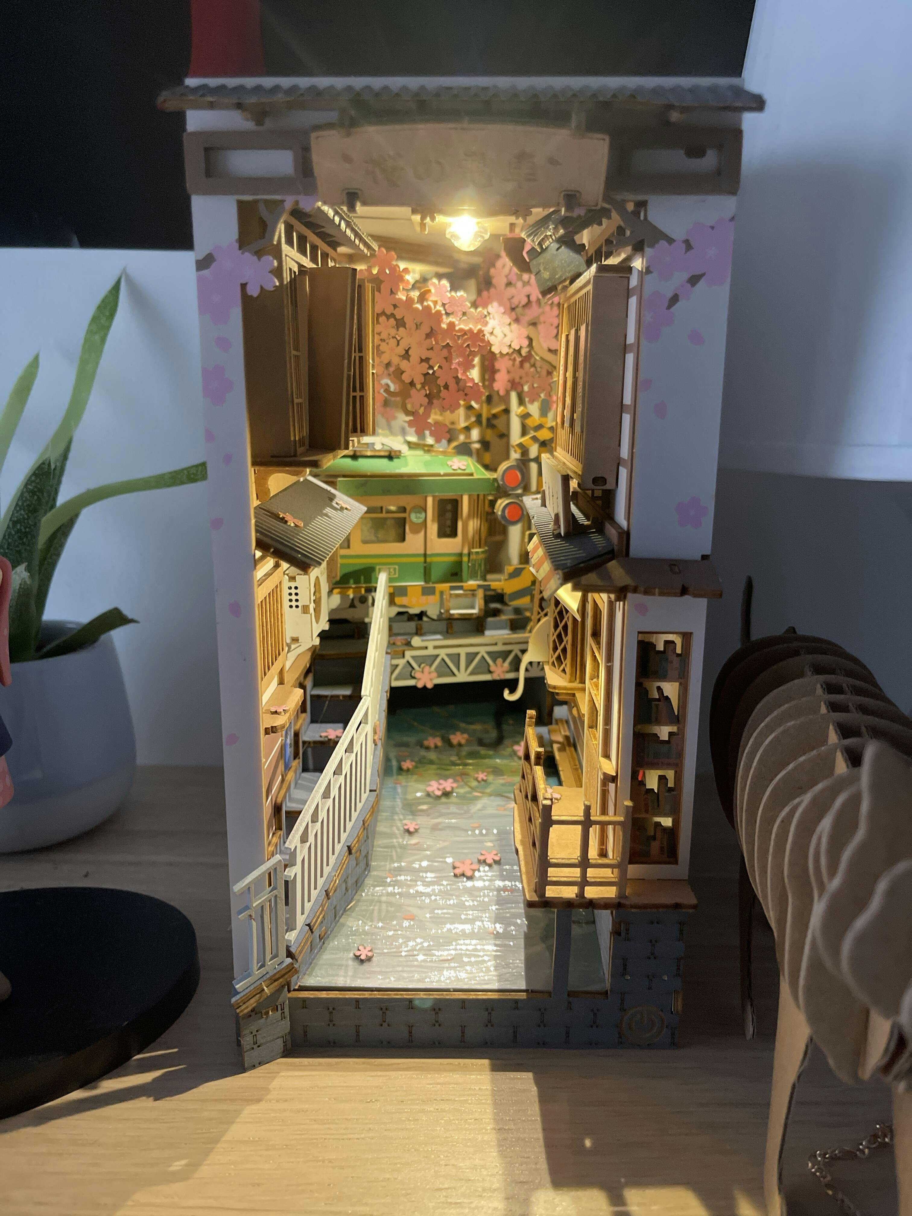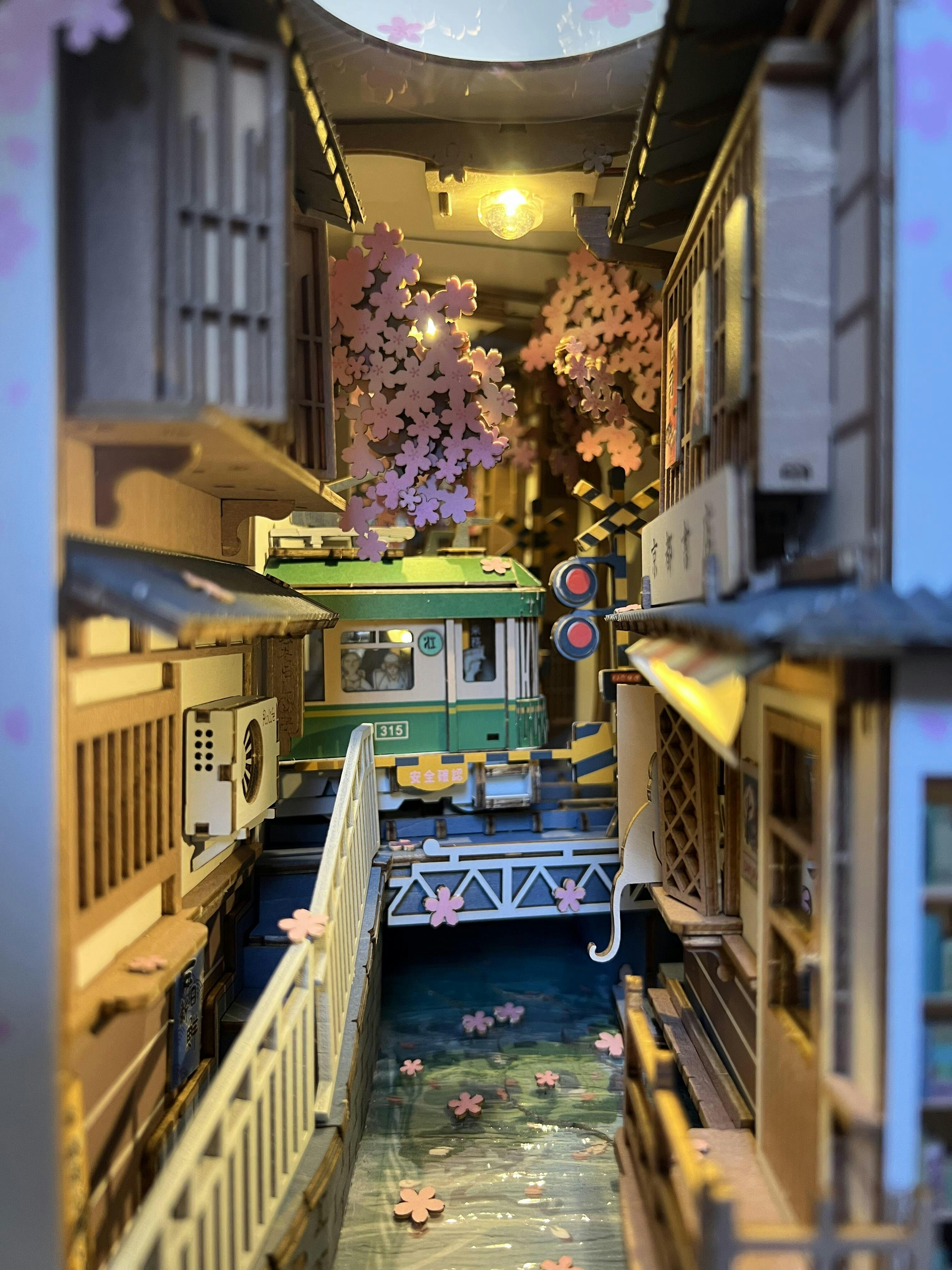 Un coin de Japon poétique, baigné de cerisiers en fleurs, lanternes suspendues et enseignes nippones. Le train traverse une ruelle calme tandis que le rose domine, créant un décor doux et nostalgique.