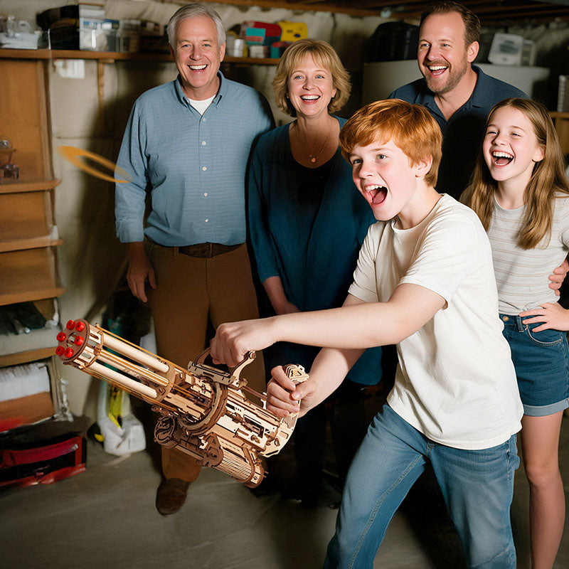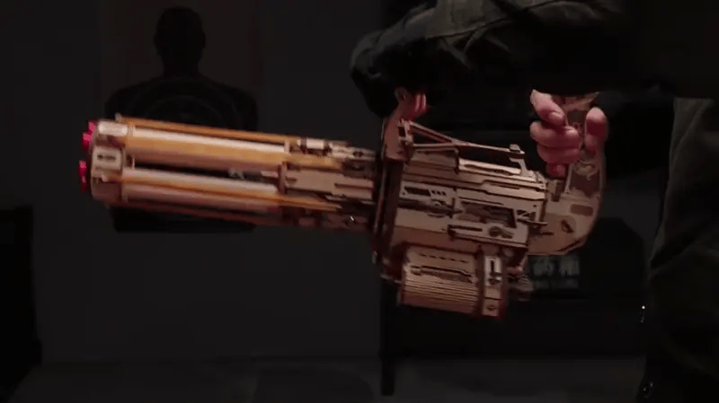 Chaque pièce est découpée au laser et s’assemble sans colle, pour une structure solide et durable. Le système à double gâchette et le barillet détachable facilitent le rechargement et rendent chaque tir fluide. Une fois montée, elle peut être utilisée ou simplement exposée. C’est un objet qui attire l’œil et suscite l’admiration. Fun, sûre et ingénieuse, cette mitrailleuse est une pièce unique à posséder.