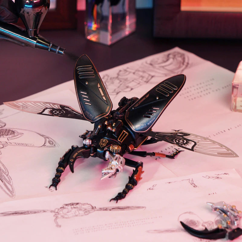 Le Scarabée MI03 s’inscrit dans la collection Mechanic Organism, fusionnant les formes emblématiques du scarabée cerf avec une esthétique steampunk renforcée. Chaque détail de ce puzzle évoque puissance et stratégie : grandes mâchoires articulées, blindage renforcé sur les pattes, et un canon dorsal imposant. Ce modèle se distingue par son allure futuriste et militaire, capable d’attaques rapprochées comme à distance. Une fois monté, il devient une créature robotique à part entière, tout droit sortie d’un univers de science-fiction.